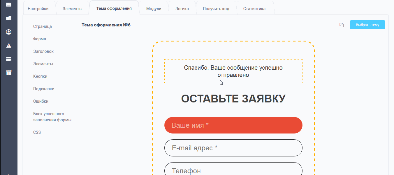 После того, как с настройками формы захвата контактов закончили, можно перейти во вкладку «Тема оформления»: