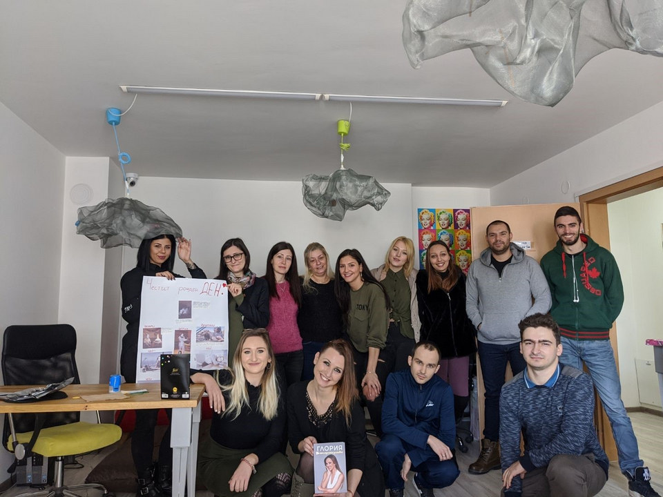 Вот как выглядит коллектив сейчас (фото сделано недавно у нас в офисе в Болгарии в честь дня рождения одной из наших сотрудниц. К сожалению, не все присутствуют на снимке, кто-то в отпуске, кто-то на обеде =))