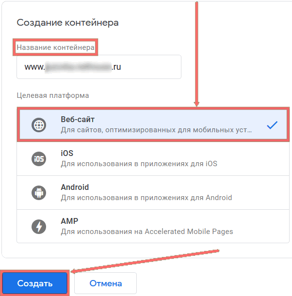 вашего сайта www.mysite.ru), выберите в списке "Целевая платформа" - Веб-сайт и нажмите кнопку "Создать":