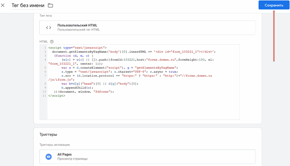 Вставьте его в Диспетчере тегов Google, пользовательский HTML, который ранее открыли. Удалите первую строчку вида <div id="form_103221_1"></div>