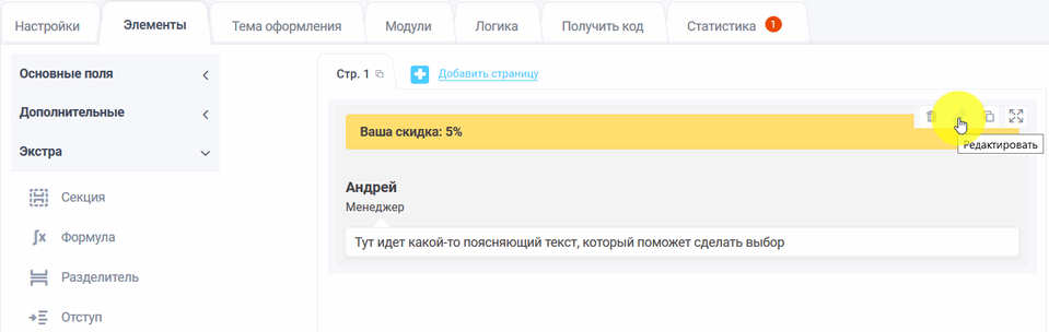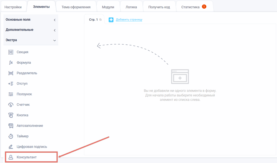 Чтобы добавить элемент "Консультант" в форму, Вам необходимо во вкладке "Элементы" в экстра полях кликнуть на