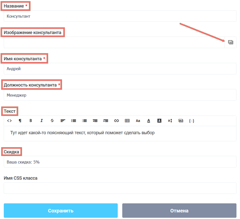 В настройках этого элемента есть поле "Название", где вы можете изменить описание консультанта, чтобы в логических правилах не путаться на какой странице находится какой консультант. В полях "Имя консультанта" и "Должность консультанта", Вы может указать имя и должность соответственно, которые буду выводится в форме. В поле "Текст", Вы можете задать поясняющий текст, который будет отображаться ниже аватара консультанта, а также указать размер скидки в поле "Скидка", которая будет выводится в заголовке элемента.