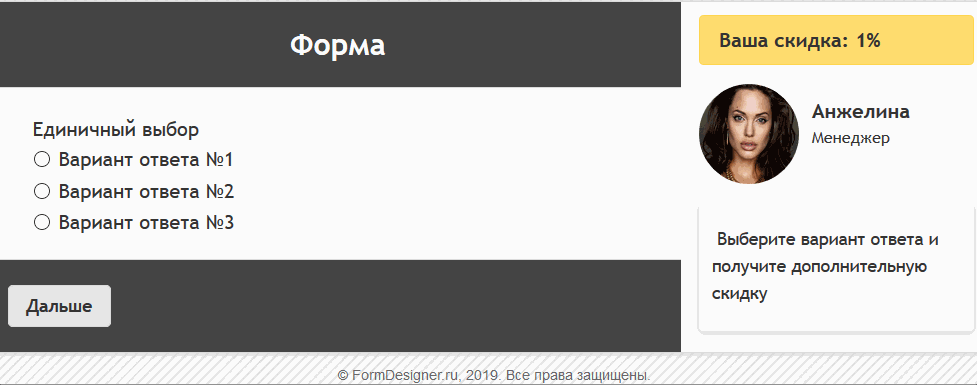 Форма будет так выглядеть, где задав, разные скидки на трёх страницах, размер её будет увеличиваться с каждой страницей: