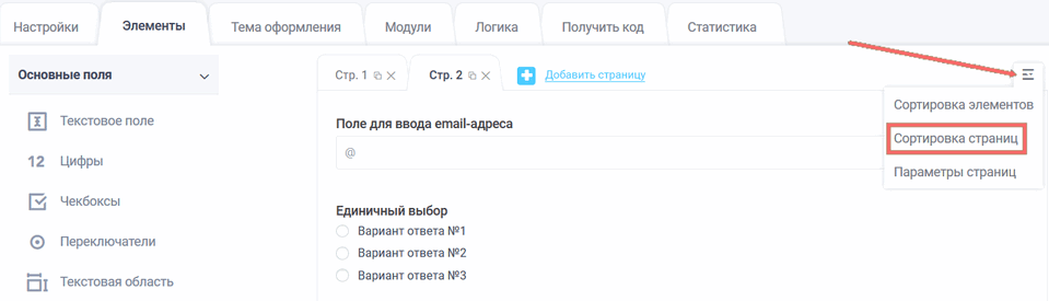 Также, как и элементы, Вы можете выполнить сортировку страниц, для этого кликните справа на меню и перед Вами откроется список. Выберите "Сортировка страниц":