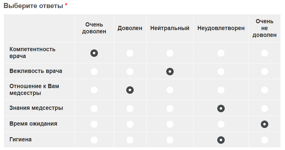 Матрица вопросов - это сочетание нескольких вопросов с одинаковыми ответами. По сути это таблица, где в качестве строк вы задаете вопросы, а колонки являются вариантами ответа и пользователь в ячейках проставляет свои варианты ответа. Для матрицы вопросов хорошо подходят вопросы со шкалами и градациями. Типичным примером является шкала Лайкерта. Вопросы в матрице значительно сокращают опрос и делают его более наглядным.