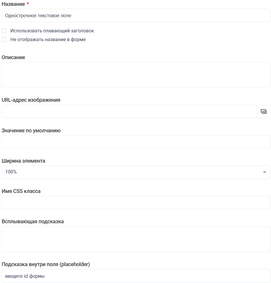 Элемент "Текстовая поле" применяется для того, чтобы ввести одну строку текста. Поле "Название" - в нём можно указать текст, а также можно отключить отображение названия в этом поле, когда активируете чекбокс "Не отображать название в форме". В поле "Значение по умолчанию" будет отображаться определённый текст, до того момента, пока пользователь не начнёт вводить данные, при этом он должен удалить текст по умолчанию. Чтобы текст отображался только до момента ввода информации, для этого используется "Подсказка внутри поля (placeholder)".