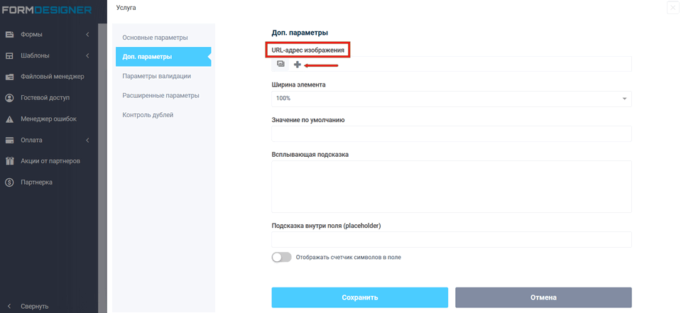 В поле "URL-адрес изображение" вы можете указать расположение изображения для формы:
