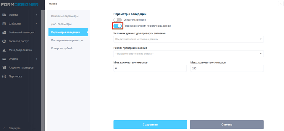 После чего ниже появится еще два дополнительных поля, где необходимо выбрать сам источник данных, по которому будет производится поиск значений и режим проверки:
