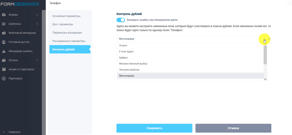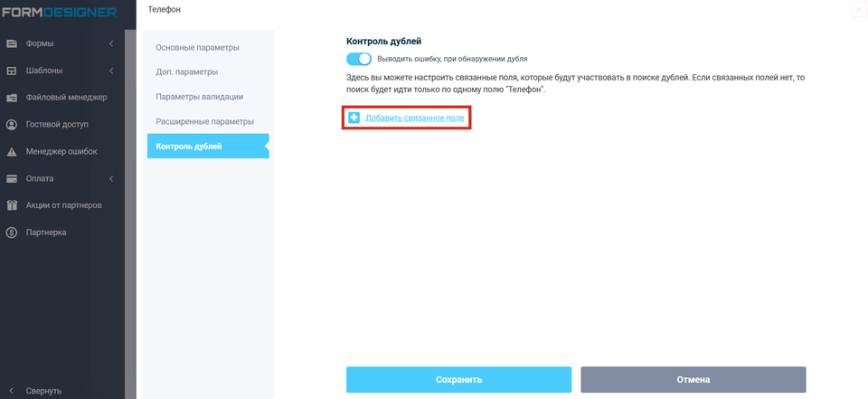 Как видно на изображении выше, после активации переключателя "Контроль дублей", ниже появилась кнопка "Добавить связанное поле". Если нажать на неё, то отобразится список элементов: