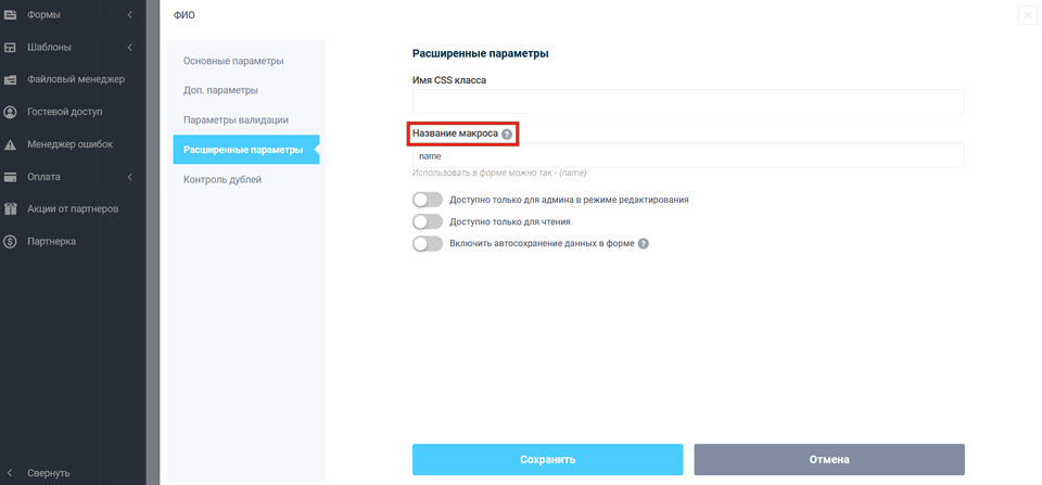 Т.е. можно в разных формах прописать одно и тоже имя макроса, и при заполнении формы это значение сохранится сразу для всех форм, где есть такой макрос. Например, для имени пользователя это можно использовать. В одной форме ввёл пользователь своё имя и потом, во всех последующих формах, его имя уже будет подставлено в поле.
