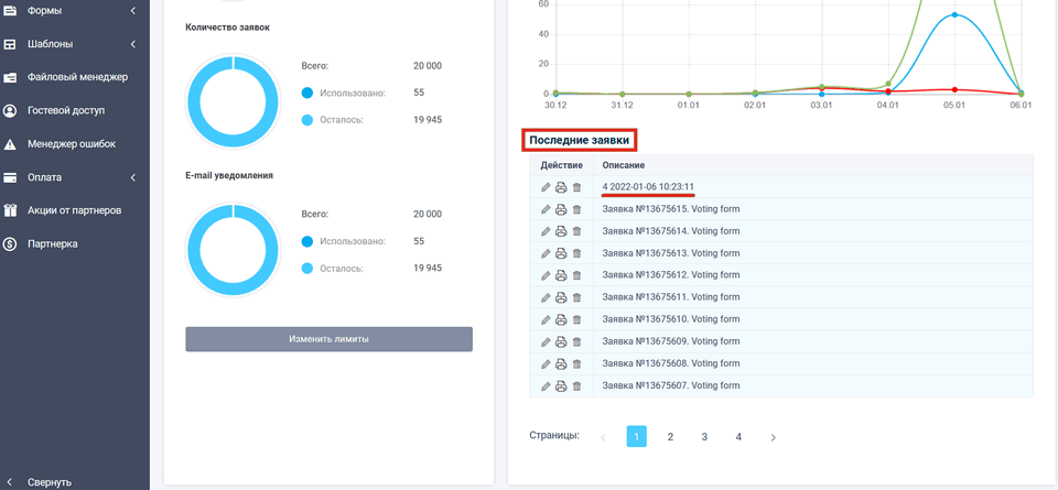 Чтобы зайти в основные параметры формы, в личном кабинете в пункте меню “Формы” кликните на пункт “Мои формы” или из главного меню список форм: