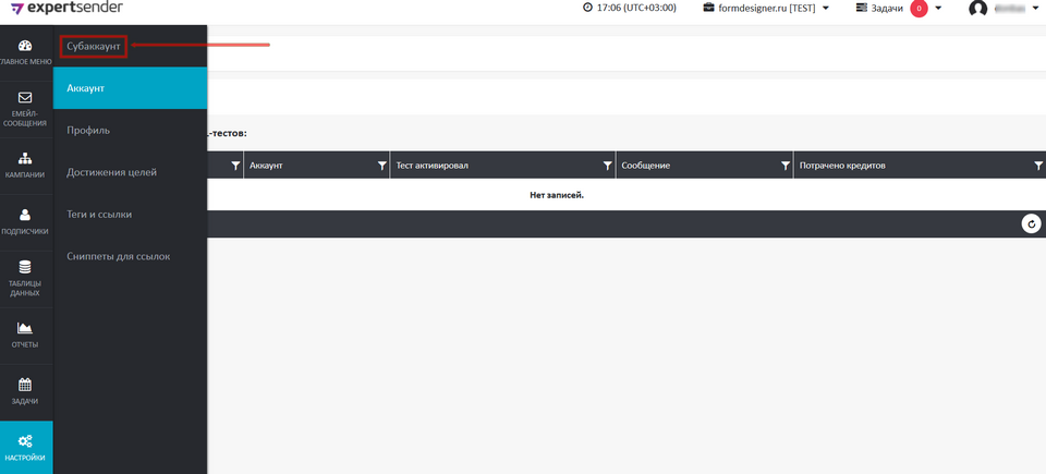Ключ доступа к API вы можете найти в своей учётной записи ExpertSender. Зайдите в настройки и выберите раздел "Субаккаунт":