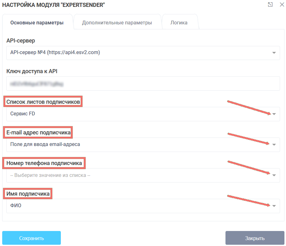 Если API-ключ и API-сервер введены верно, то перед вами раскроются дополнительные настройки: