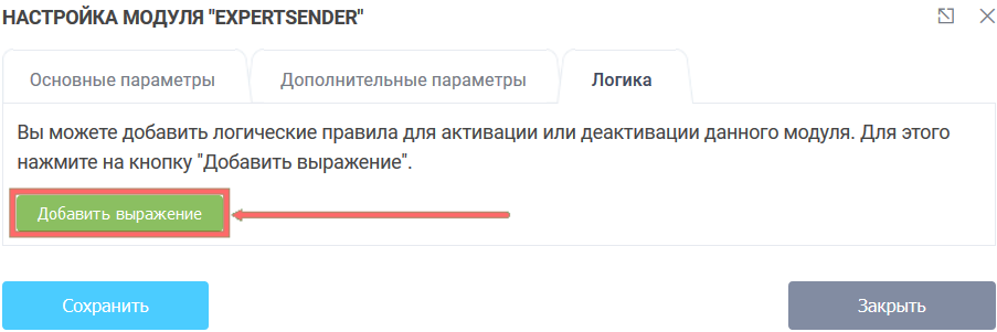 Во вкладке "Логика" вы можете добавить логические правила для активации или деактивации модуля интеграции ExpertSender. Для этого нажмите на кнопку "Добавить выражение" и выберите правило, при котором модуль будет активирован или деактивирован: