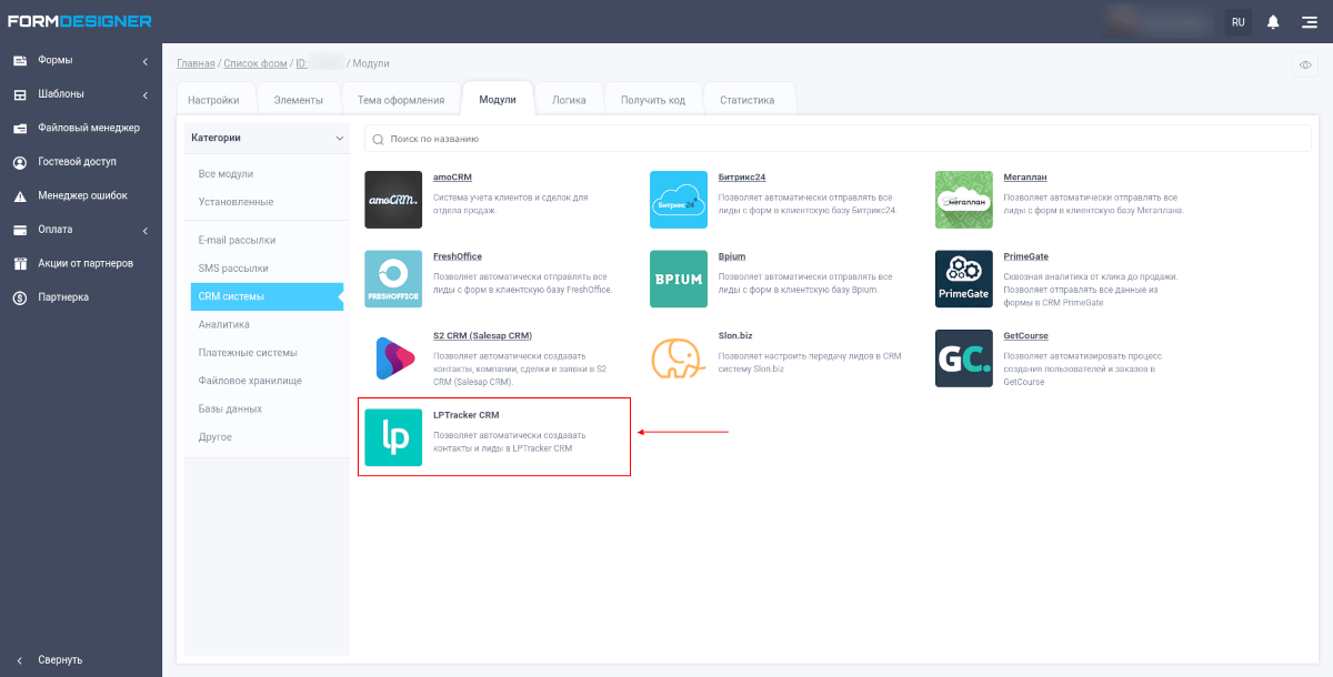 Для того, чтобы настроить эту интеграцию, необходимо открыть нужную форму и перейти во вкладку “Модули”. Там в разделе “CRM системы” нужно найти модуль LPTracker: