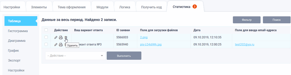 Во вкладке "Статистика", если Вы удалите заявку, то загруженный файл останется на Яндекс.Диске: