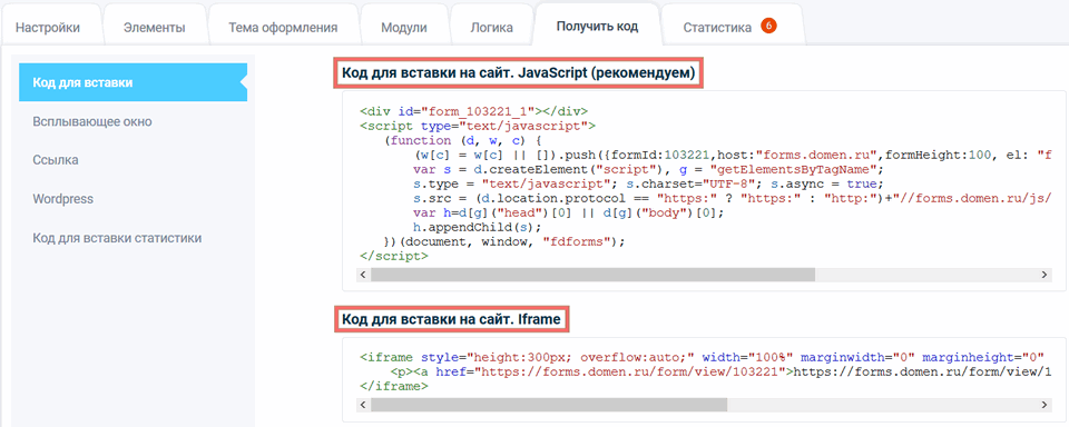 В разделе "Код для вставки" доступны 2 вида: