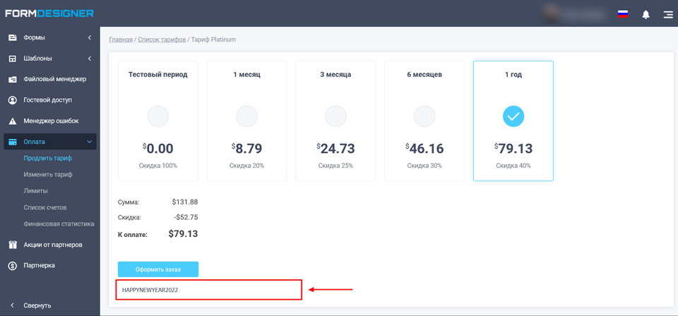В период с 22 декабря по 31 декабря 2021 г. включительно успей оплатить любой тариф со скидкой до 40% (зависит от срока оплаты)!