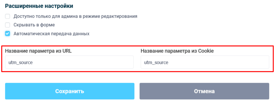 Теперь же вы можете прямо в личном кабинете указать название параметров, которые нужно сохранить из URL или куки в форме.