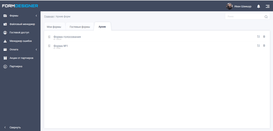 Если нажать на кнопку "Удалить форму", то форма будет безвозвратно удалена, но если нажать на кнопку "Переместить в архив", то форма станет неактивная и будет выводиться во вкладке “Архив”: