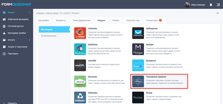 Для того, чтобы настроить онлайн-оплату с помощью этой платежной системы, необходимо в нужной форме перейти в раздел "Модули" и активировать там модуль "Платежный терминал":