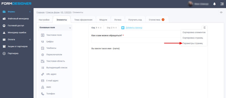 Для того, чтобы была возможность активировать пошаговую форму, в начале нужно добавить в форму несколько страниц. После чего вам станут доступны параметры страниц: