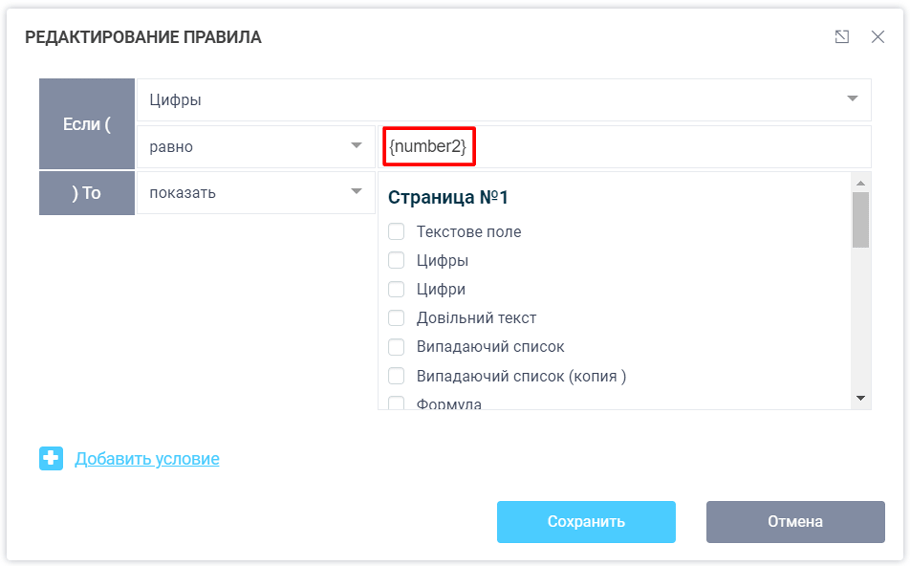 На картинке выше, мы сравниваем значение поле “Цифры” с другим полем, у которого настроен макрос - {number2}.