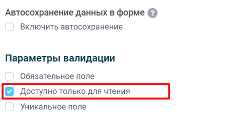 Включив этот чекбокс, поле в форме будет выводиться только для чтения и пользователь не сможет его изменить.