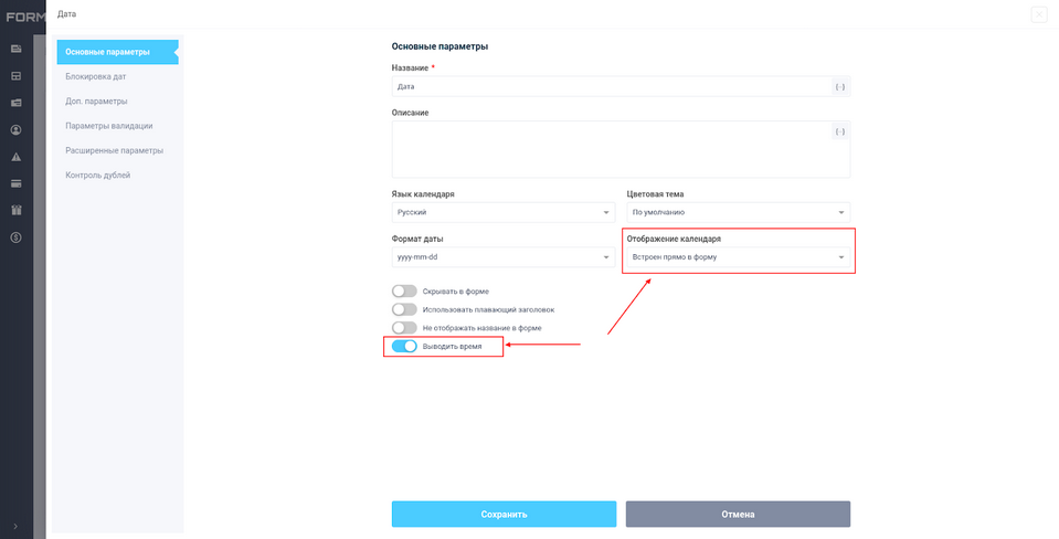 Чтобы активировать эту опцию перейдите в настройки элемента формы “Дата”, выберите в поле “Отображение календаря” значение “Встроен прямо в форму”, а также включите переключатель “Выводить время”:
