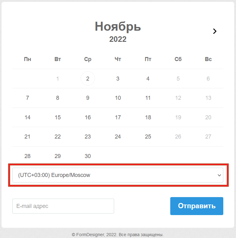 Активировав этот переключатель, в форме, ниже календаря, появится выпадающий список со всеми часовыми поясами, где автоматом будет выбран часовой пояс клиента: